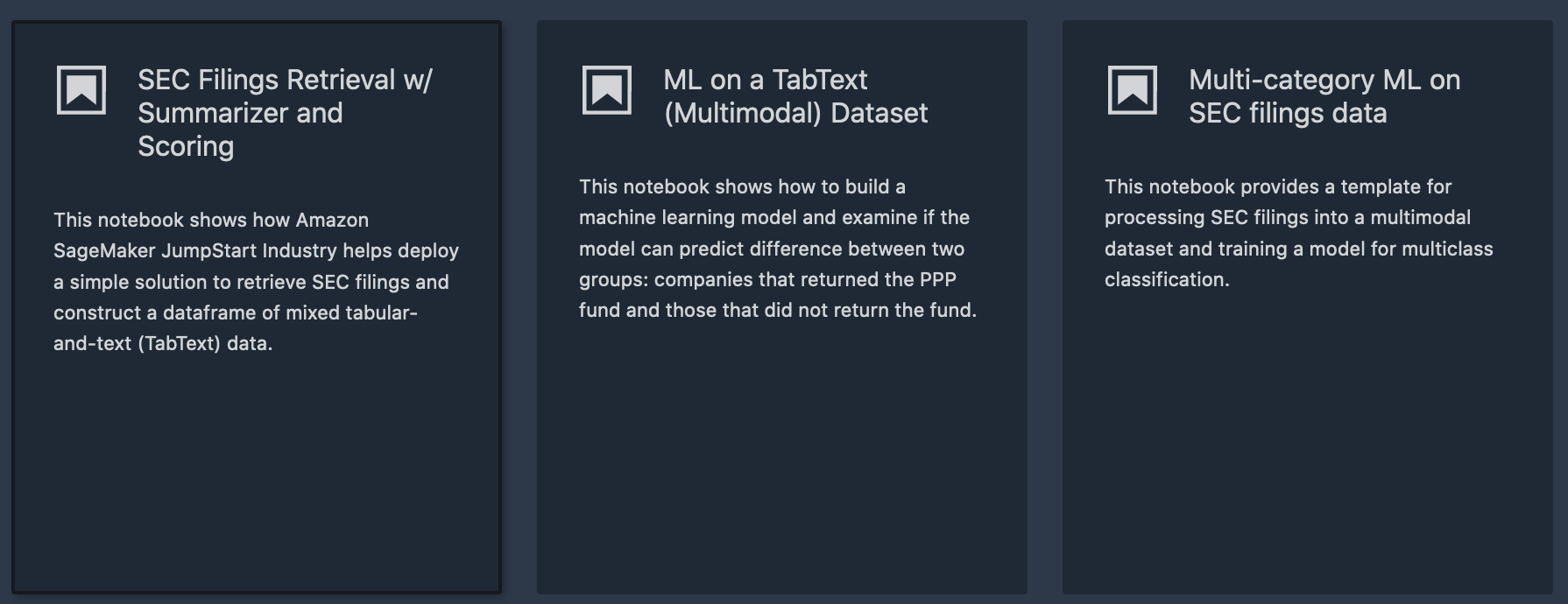 SEC 文件检索 W/ 摘要器和评分— 此示例介绍如何使用 SageMaker JumpStart 用于处理 SEC 申报的行业 Python SDK,例如基于 NLP 分数类型及其相应词汇表的文本总结和评分文本。要预览此笔记本的内容,请参阅根据 SEC 申报和 NLP 分数简单构建多模态数据集
