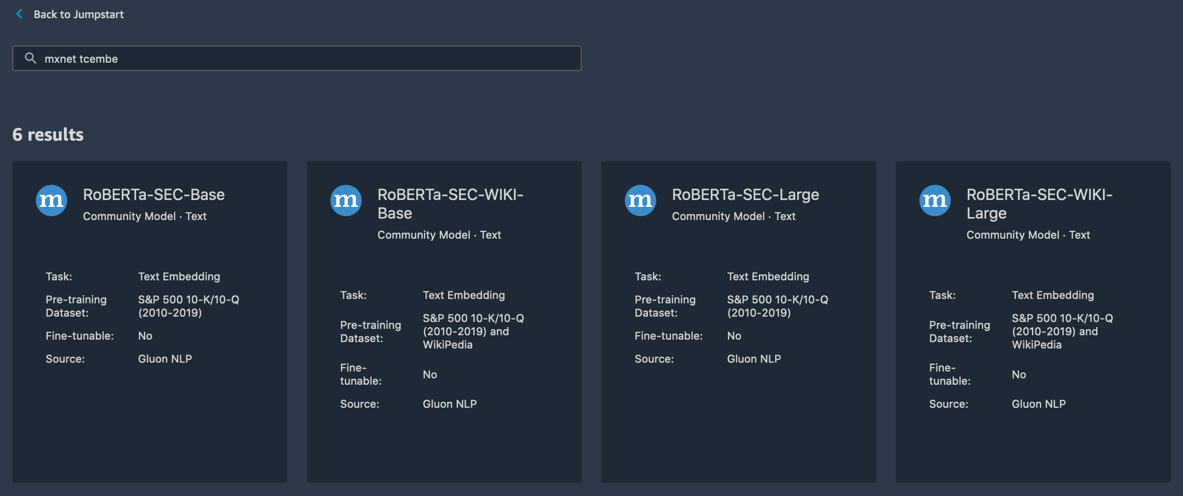 SageMaker JumpStart 行业提供以下预培训强大优化的 BERT 方法(RoberTA)