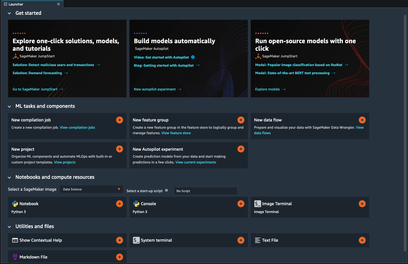 您可以使用亚马逊 SageMaker Studio Launcher 用于创建笔记本和文本文件,并启动终端和交互式 Python 外壳。