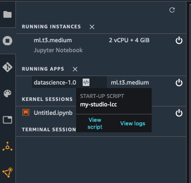 /aws/sagemaker/studio以及以下日志流{Domain}/{UserProfile}/{AppType}/{AppName}/LifecycleConfigOnStart. 有关添加权限的信息,请参阅。启用特定日志记录Amazon服务. -