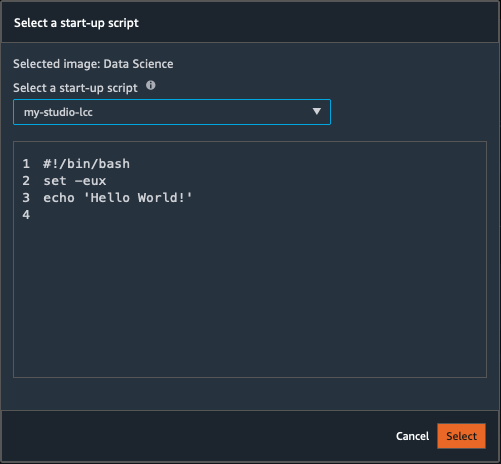 创建 Studio 生命周期配置。以下命令创建一个生命周期配置,该配置在启动关联的 KernelGateway 应用程序。